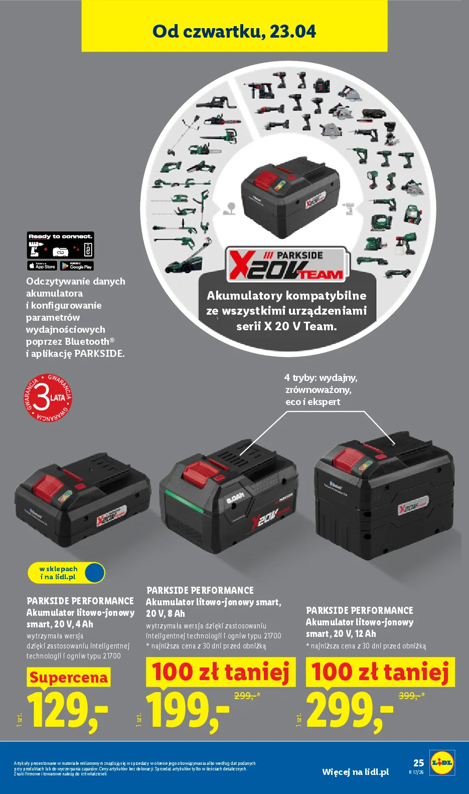Akumulator litowo-jonowy PARKSIDE PERFORMANCE o napięciu 20 V i pojemności 4 Ah to wydajne źródło zasilania dla narzędzi z serii PARKSIDE X 20 V Team. Dzięki technologii Smart i łączności Bluetooth, akumulator umożliwia monitorowanie jego parametrów, takich jak stan naładowania czy pozostały czas pracy, za pomocą aplikacji Lidl Home. Użytkownik może również konfigurować tryby pracy (Performance, Balanced, Eco, Expert) dla optymalnego dopasowania do wykonywanego zadania. Technologia Cell Balancing zapewnia równomierne obciążenie ogniw, co przekłada się na dłuższą żywotność i większą wydajność akumulatora. Akumulator posiada 3-stopniowy wskaźnik naładowania LED, a jego obudowa jest odporna na wstrząsy.